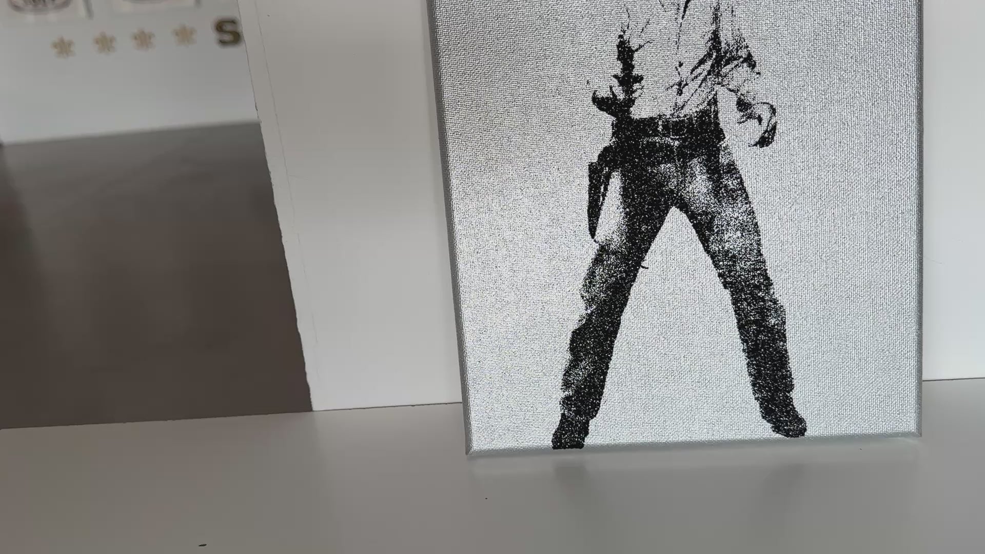 Elvis (Silver) by WarHo™ is a 2025 screenprint on canvas that renders the iconic image of Elvis with a quiet, metallic shimmer. Set against a reflective field of silver acrylic, the portrait carries the cool glow of the silver screen and a subtle nod to the silver-coated walls of Warhol’s Factory. In this smaller, more intimate format, the iconicity of the image feels distilled—less like spectacle, more like artifact.