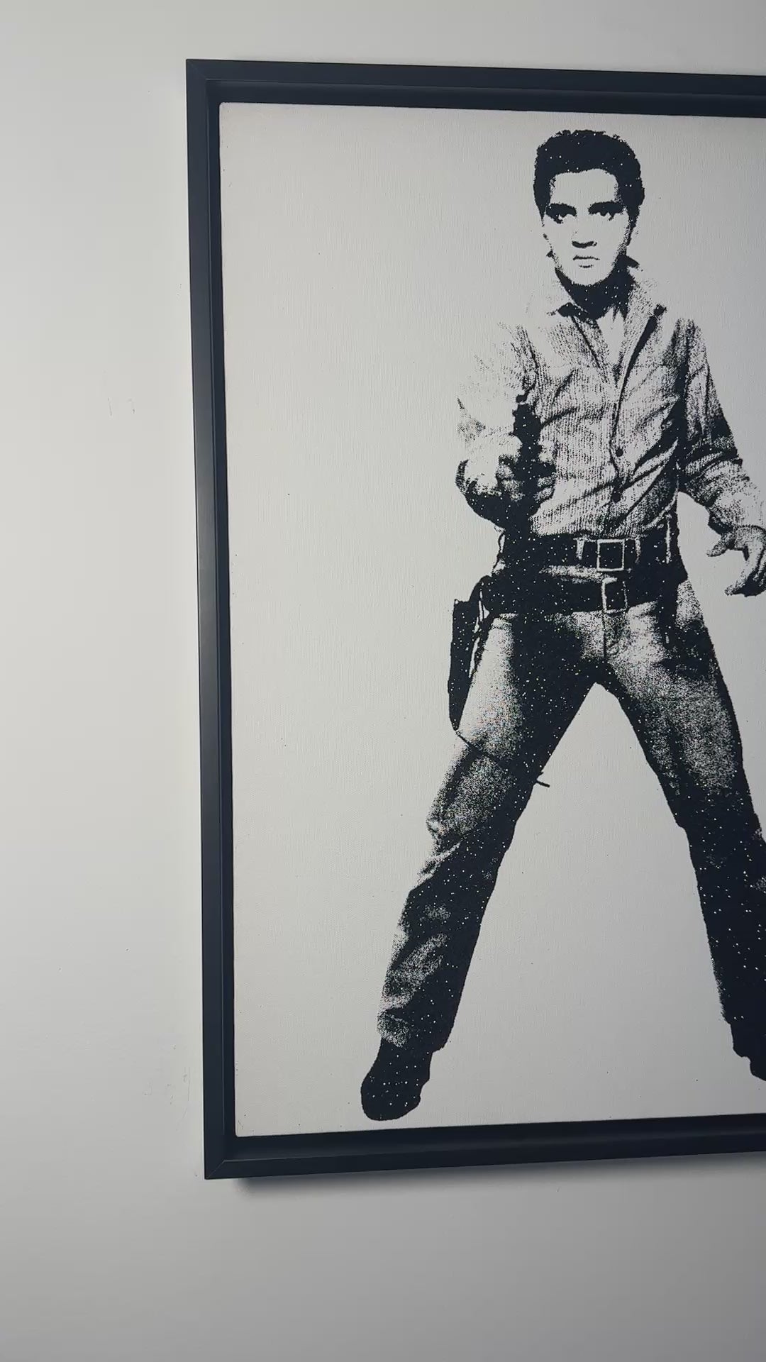 Elvis (White) by WarHo™ is a 2025 screenprint on canvas in which the iconic image of Elvis is rendered in a classic negative/positive, black and white with Diamond Dust. In this smaller, more intimate format, the iconicity of the image feels distilled—less like spectacle, more like artifact.